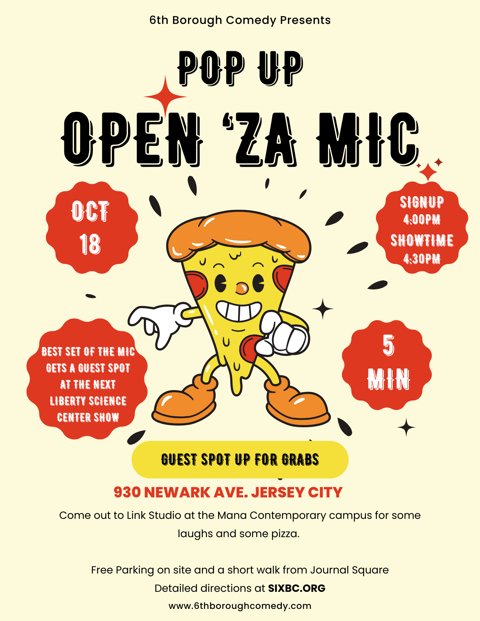 Think you're funny? All are welcome to signup for a 5 min set! Come enjoy some pizza and best set of the night gets a guest spot at the next Liberty Science Center show!